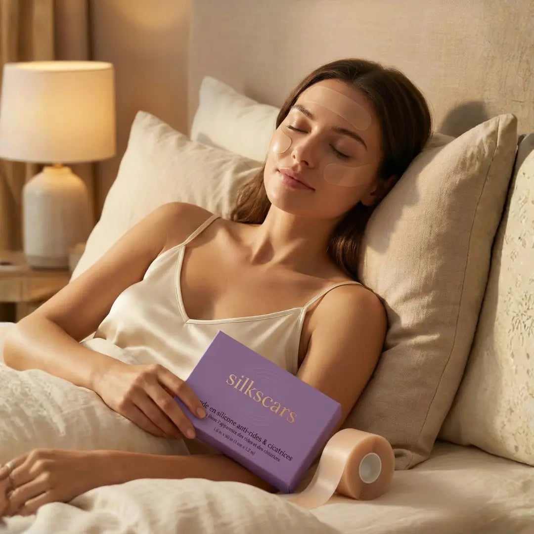 Redécouvrez une peau lisse et rebondie grâce aux bandes en silicone Silkscars. Elles créent un micro‑environnement hydratant qui aide à estomper les rides et à lisser les plis du front, du contour des yeux ou de la bouche, pendant que vous dormez.