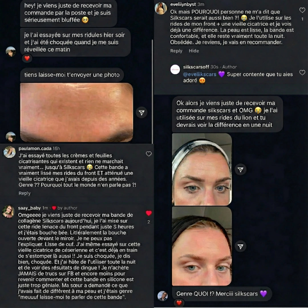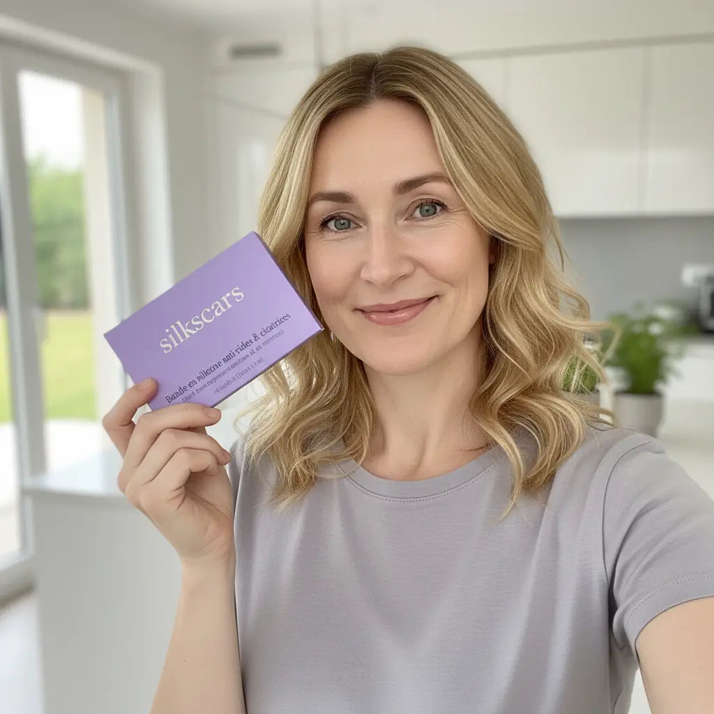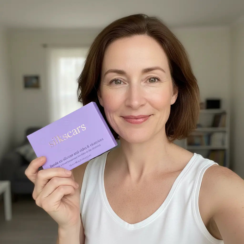 SilkScars agit pendant la nuit pour adoucir les plis marqués, afin que vous puissiez recommencer à sourire librement — en vous réveillant chaque jour un peu plus vous‑même.